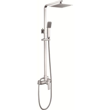 Комплектация: смеситель, душевая стойка, верхний душ, душевая лейка, душевой шланг, держатель для душевой лейки, настенный держатель, отражатели, эксцентрики