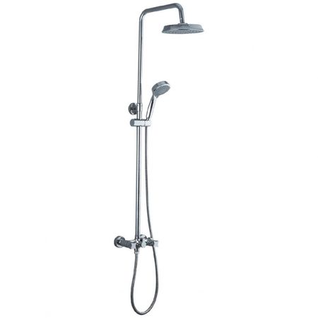 Комплектация: смеситель, душевая стойка, верхний душ, душевая лейка, душевой шланг, держатель для душевой лейки, настенный держатель, отражатели, эксцентрики