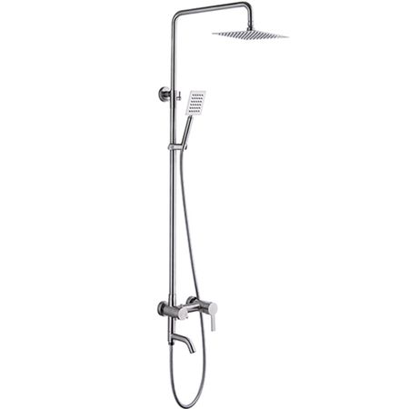 Комплектация: смеситель, душевая стойка, верхний душ, душевая лейка, душевой шланг, держатель для душевой лейки, настенный держатель, отражатели, эксцентрики