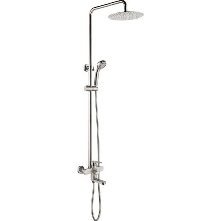 Комплектация: смеситель, душевая стойка, верхний душ, душевая лейка, душевой шланг, держатель для душевой лейки, настенный держатель, отражатели, эксцентрики