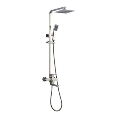 Комплектация: смеситель, душевая стойка, верхний душ, душевая лейка, душевой шланг, держатель для душевой лейки, настенный держатель, отражатели, эксцентрики