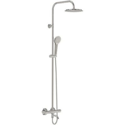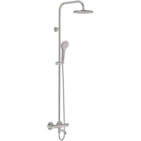Душевая система с термостатическим смесителем Rock из латуни со складным изливом. Излив также является переключателем на верхний душ. Благодаря такому эффекту подходит как для использования с ванной, так и в душевой кабине. Поддерживает постоянную температуру воды, охраняет от перепадов давления в системе, от ожогов и экономит расход воды. Стойка для верхнего душа 1400 мм круглого сечения телескопическая, позволяет настроить комфортную высоту с учётом роста пользователя.