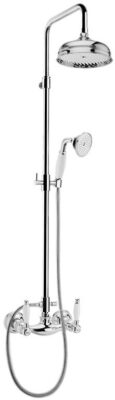 Описание:душевая система с круглым верхним душем, с двухвентильным смесителем без излива, с ручками, стилизованными под керамику.