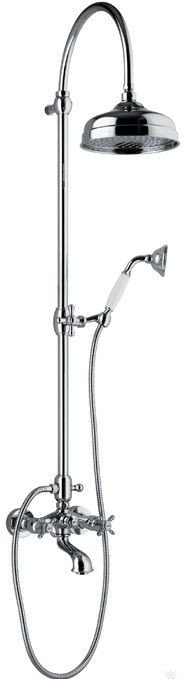 Описание:душевая система с круглым верхним душем, с ручным душем, штангой, шлангом, с двухвентильным смесителем с изливом.