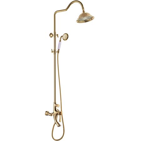 Изящная душевая стойка в золотом исполнении от компании «Радомир» — воплощение грации и функциональности. Душевой комплект включает в себя верхний душ, ручную лейку, смеситель и излив. Стойка крепится к стене и может быть установлена совместно с ваннами, душевыми углами и ограждениями. Материалом для душевого гарнитура служит надежная и благородная латунь с роскошным никелевым напылением с позолотой. Такое покрытие не только красиво выглядит, но и защищает от коррозии. Безупречное качество и современные технологии прослеживаются в каждом элементе душевого комплекта. Золотое покрытие с ослепительным блеском выполнено по технологии Radomir® StarLight. Оно обладает грязеотталкивающими свойствами, устойчиво к потускнению и появлению царапин. Высокопрочный шланг защищен от перекручивания и возникновения разрывов благодаря фирменной технологии Radomir®NoTwist. Рычаг переключения между режимами «излив-душ» и ручную лейку украшают элегантные керамические вставки с великолепным растительным орнаментом. Особый состав материала и качественная глазуровка исключают любые изменения цвета, растрескивание, а также обеспечивают легкий уход. Специальный рычаг позволяет регулировать высоту фиксации душевой лейки. Таким образом, можно «настроить» душевую стойку под необходимый рост для комфортного принятия душа. Экстра плавное управление рычагами и вентилями обеспечивается благодаря технологии Radomir® SoftDelight. Регулировка осуществляется легким движением руки, создавая абсолютно новые ощущения от привычных действий. В обеих лейках реализована система против известкового налета Radomir®SpeedClean. Отверстия на рассекателе представляют собой мягкие резиновые дюзы, которые не позволяют лейке ржаветь и забиваться. В результате Вы получаете ровный душевой поток, отличный душевой эффект и долгий срок службы. Утонченная душевая лейка в золотом исполнении от компании «Радомир» позволит создать особый уют, комфорт и неповторимый эксклюзивный стиль ванной комнаты. Дополнительные характеристики: Напыление: никель — 8 мк, позолота 0,2 мк; Пропускная способность крана: 18 л/мин.