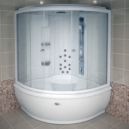 Данная модель выполнена в традиционном белоснежном цвете, оснащена ударопрочными стеклянными дверцами и имеет угловую компактную конструкцию овальной формы. За счет такой конструкции бокс способен разместиться в помещении достаточно компактно. При этом в одном изделии Вы получите и полноценную ванну, и душевую, и даже массажный комплекс. В этом и есть основное преимущество боксов перед обычными душевыми кабинками и ваннами. Перед сном для полного расслабления Вы сможете принять релаксационную ванну, успокаивающую и умиротворяющую тело и психику. Чтобы взбодриться и настроиться на предстоящий день, Вы можете воспользоваться гидромассажным душем.