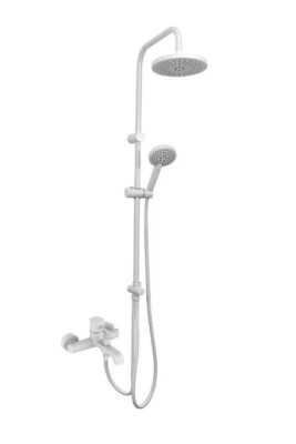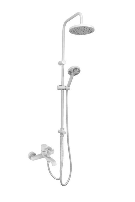 Душевой комплект с смесителем для ванны/душа в цвете белый глянец: верхний душ (d200 мм) создаёт эффект тропического дождя, что дарит непередаваемые эмоции во время ежедневных банных процедур. Ручной душ 100 мм (3 режима) на гибком полутораметровом шланге (в металлической оплетке) с защитой от перекручивания. Держатели верхнего и ручного душа с регулировкой угла наклона, штанга 970 мм. Подвижные детали отличаются долговечностью. Фиксируется душевая система непосредственно на стене, что позволяет рационально использовать ограниченное пространство ванной комнаты.