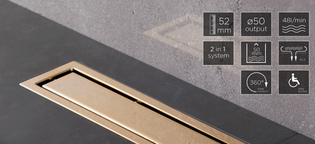 Рамка и решетка из нержавеющей стали (AISI 304 SS), класс К3 (до 300 кг нагрузки, в соответствии с EN 1253). Покрытие: золото 24 карата.