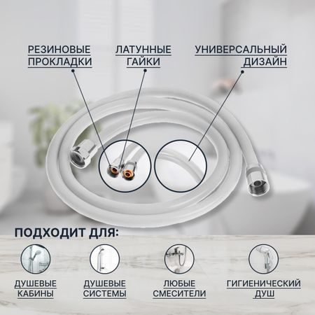 Душевой шланг ZEIN Z12PG, 150 см, антиперекручивание, латунные гайки, белый, Имп/Имп. Душевой шланг — соединительный элемент, предназначенный для подачи воды к душевой лейке. <b> Особенности</b> <li> Гибкая конструкция изделия удобна в эксплуатации.</li> <li> Простой монтаж и продолжительный срок службы.</li> <li> Длина изделия — 150 см.</li> <li> Цвет шланга — светло-серый.</li> <li> Оплетка выполнена из ПВХ.</li>