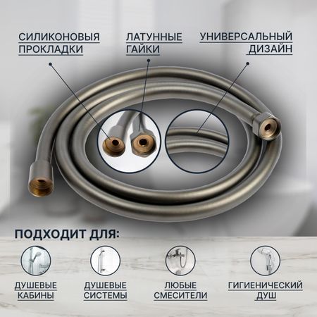 Душевой шланг ZEIN Z3645, 150 см, латунные гайки 1/2", оплетка ПВХ, графит, Имп/Имп. Душевой шланг ZEIN предназначен для подключения душевой лейки к смесителю. Оптимальная длина в 150 см удобна как для ванной, так и для использования в душевой кабине. Достоинства этого устройства в том, что трубка не выпадет из лейки, благодаря прочному крепежу. Оплетка шланга – ПВХ, латунные гайки — 1/2".