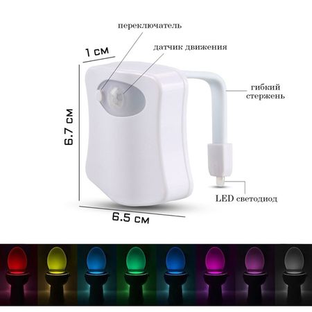 Подсветка для унитаза с датчиком движения — функциональный аксессуар ванной комнаты, который поможет с комфортом передвигаться вам и вашему ребенку в ночное время, а также экономит электроэнергию.Особенности:Материал: ABS пластикИмеет датчик движения, благодаря чему подсветка автоматически активируется на любое движение в полной темноте. Отключается самостоятельно примерно через 2 минуты после прекращения движенияДиапазон срабатывания: 2-3 метраМожно в игровой форме приучать детей и даже изучать цветаСветильник универсальный и подходит для всех унитазовВодонепроницаемый16 вариантов подсветкиМощность: 0.1 ВтРаботает от батареек типа ААА (3 шт, в комплект не входят)