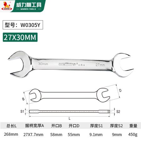 Гаечный ключ Wynns с открытым зевом, универсальный гаечный ключ, гаечный ключ из хромованадиевой стали, зеркально полированный, гаечный ключ для авторемонта, инструмент 27*30 мм
