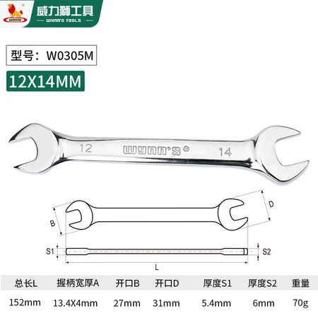 Гаечный ключ Wynns с открытым зевом, универсальный гаечный ключ, гаечный ключ из хромованадиевой стали, зеркально полированный, гаечный ключ для ремонта автомобилей, инструмент 12*14 мм