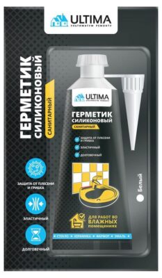 Санитарный кислотный силиконовый герметик с содержанием фунгицидов. Рекомендуется для ванных комнат, кухонь и других помещений с повышенной влажностью. Обладает отличной адгезией к стеклу, керамике, алюминию, окрашенным и лакированным поверхностям. Время образования пленки 10-25 мин. Максимальное растяжение 200%.