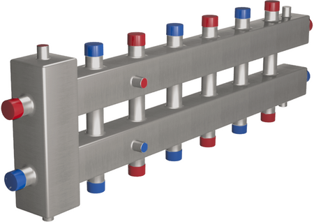 RISPA (РИСПА) ГРУ+КМГ 100-7ВУ НЕРЖ. представляет собой гидравлический разделитель с коллектором, используемый в отопительных системах. Он рассчитан на 7 отопительных контуров и подключается к котлу, мощность которого не превышает 100 кВт. Имеет горизонтальную установку и универсальное подключение потребителей.