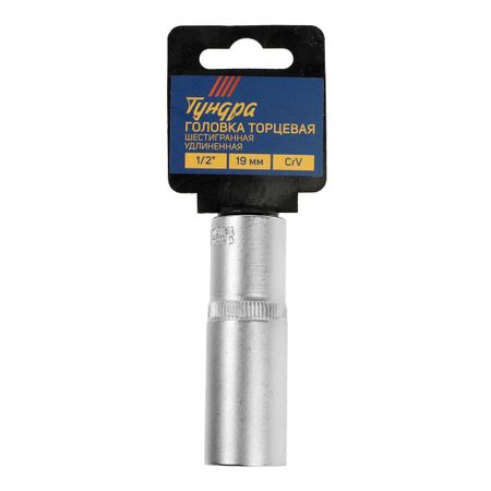 Головка торцевая шестигранная удлиненная ТУНДРА, под квадрат 1/2", 19 мм, CrV. Торцевые головки — альтернатива гаечным ключам. Они востребованы в предприятиях автосервиса, среди индивидуальных автовладельцев, а так же в быту. Инструмент изготовлен из прочной, высококачественной инструментальной стали, закаленной до твердости 45 HRC. Изделие широко используют на производстве и в автосервисах.