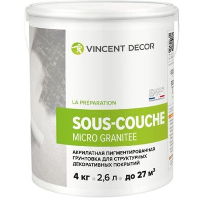 Акрилатная пигментированная грунтовка для структурных декоративных покрытий Vincent Décor. Образует непрозрачное глубокоматовое паропроницаемое покрытие с шероховатой поверхностью, облегчающей нанесение структурных покрытий, регулирует впитывающую способность основания, снижая расход структурного покрытия. Может колероваться в цвет близкий к цвету финишного покрытия, способствует достижению его равномерного цвета. Применяется с материалами Decorum Rustique, Decorum Andalousie, Decorum Village, Decorum Travertino, Travertino Romano.