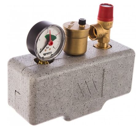 Группа безопасности отопительного котла Watts (Ваттс) KSG 30/ISO2 (до 50 кВт) (в теплоизоляции) состоит из нескольких основных элементов: манометр, воздушный клапан, предохранительный клапан. Все детали конструкции расположены на стальной консоли. Устройство защищено от потерь тепла и риска ожогов теплоизоляцией из полистирола.