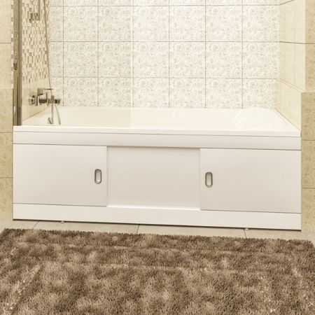 Экран от российского производителя «СанТа» не только скроет сантехнические коммуникации, но и позволит организовать удобное пространство для хранения хозяйственных вещей под ванной. Для его изготовления используется МДФ, ламинированная пленкой ПВХ. Изделие устойчиво к воздействию влаги и высоких температур. Высота трехсекционного ограждения с двумя раздвижными дверями регулируется четырьмя ножками. Монтаж конструкции не требует специальных навыков.