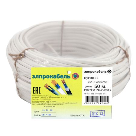 Главная » Строительство и ремонт кабель ПуГВВ-П ЭлПроКабель плоский 2х1,5 50 м белый Просмотров 10 Тип кабеля: ПуГВВ-П Количество жил: 2 шт. Сечение: 1,5 кв.мм. Метраж упаковки: 50 м. Форма кабеля: плоский Заземление: Без заземляющего контакта ЭЛПРОКАБЕЛЬ