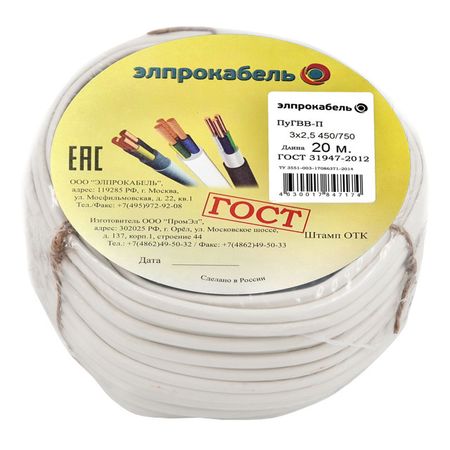 Главная » Строительство и ремонт кабель ПуГВВ-П ЭлПроКабель плоский 3х2,5 20 м белый Просмотров 9 Тип кабеля: ПуГВВ-П Количество жил: 3 шт. Сечение: 2,5 кв.мм. Метраж упаковки: 20 м. Форма кабеля: плоский Заземление: С заземляющим контактом ЭЛПРОКАБЕЛЬ