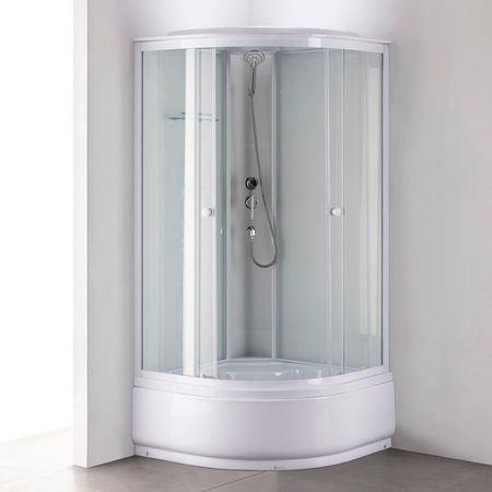 Материал: закаленное стекло, алюминий, пластик Толщина стекла: 4 мм Форма: 1/4 круга Тип по исполнению: стандартный Тип поддона: высокий Изображения на стекле: нет Размер: 90х90х210 см Комплектация: верхний душ, ручной душ, полка Высота поддона: 40 см Крыша: да Профиль: алюминий, 1 мм, белый