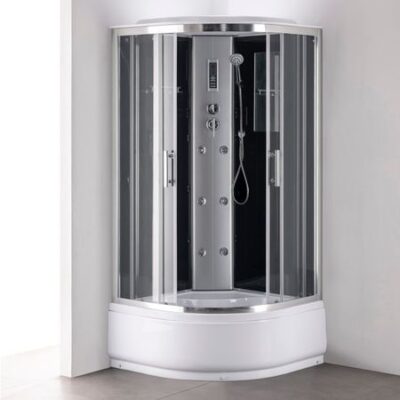 Материал: закаленное стекло, алюминий, нерж.сталь, пластик Толщина стекла: 4 мм Форма: 1/4 круга Тип по исполнению: стандартный Тип поддона: высокий Размер: 90x90x215 см Количество форсунок: 6 Комплектация: верхний душ, ручной душ, полка, зеркало, панель управления (свет, вентилятор, радио) Высота поддона: 40 см Крыша: да Профиль: алюминий, 1 мм, хром