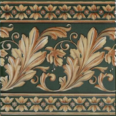 Декор квадратной формы зелёного цвета с бежевым орнаментом придаст помещению неповторимую самобытность и оригинальность. Плитку Majesty Verde Botella можно использовать в качестве акцента к основному фону в дизайнерской идее интерьера ванной, санузла и кухни.
