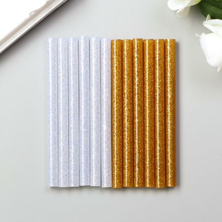 Клеевые стержни для клеевого пистолета "Золото и серебро" 7ммх10 см (набор 12 шт). Термоклей можно использовать при работе с разными материалами: стеклом и керамикой, бумагой и деревом, пластиком и пенопластом. Он представляет собой стержень, который вставляется в клеевой пистолет и при нагревании начинает превращаться в привычный жидкий клей. Выпускаются разного диаметра, поэтому важно, чтобы диаметр стержня соответствовал пистолету. Стержни всевозможных цветов применяются с разной целью. Самыми универсальными являются бесцветные. А стержни с блестками могут применяться в качестве самостоятельного декора. Используются в паре с клеевыми пистолетами. <b> Обратите внимание.</b> Стержень достаточно легко изгибается и при этом не ломается. Хранить рекомендуется без замораживания, при комнатной температуре. Срок годности клеевого состава не ограничен.