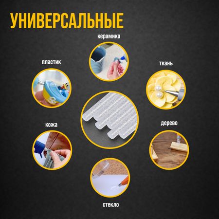 Клеевые стержни ТУНДРА, 7×100 мм, серебристые с блестками, 6 шт.. <ul> <li> используются в качестве расходных материалов для клеевых пистолетов</li> <li> обеспечивают надежное склеивание различных материалов: бумаги, пластика, дерева, керамики, ткани, кожи и других</li> <li> используются для герметизации швов и трещин</li> <li> изготовлены из полимера ЭВА (этиленвинилацетат) с добавлением воска и смолы: нетоксичные, водостойкие</li> <li> подходят для маломощных клеевых пистолетов (плавятся при температуре около 100°)</li> </ul>