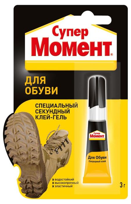 Клей Супер Момент для обуви однокомпонентный гелеобразный клей на основе цианакрилата, который отлично подходит для быстрой и надежной починки обуви из кожи, кожзаменителя, резины, ткани и других материалов. Также можно склеивать такие материалы как картон, бумага, дерево, металл, керамика, пластмассы. Эластичный, прозрачный, водостойкий, склеивает мгновенно.