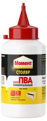 Клей Момент Столяр ПВА Универсальный предназначен для различных пород дерева. С его помощью склеивают ДСП, фанеру, шпон, ламинат, картон, фурнитуру, ткань, кожу, некоторые пластики. Шов получается высокопрочный и устойчивый к кратковременному воздействию воды (водостойкость D2). Используют, например, при сборке и ремонте мебели. Такой клей хранят при температуре от +5С до +30С, нужно беречь от мороза.