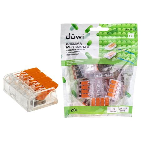 Главная » Строительство и ремонт клемма соединительная DUWI 4-проводные 4 кв.мм СМК 223-414 прозрачные 20шт прозрачный Просмотров 12 Количество подключаемых проводов: 4 шт. Макс. сечение жилы: 4 кв.мм Количество в упаковке: 20 шт Термопаста: нет Цвет: прозрачный DUWI