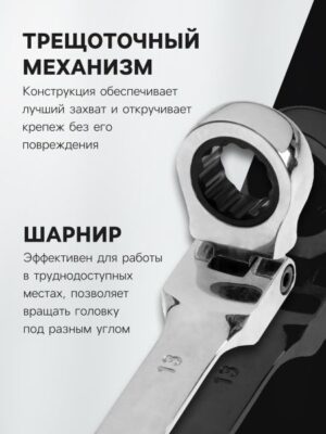 Ключ комбинированный трещоточный шарнирный ТУНДРА, CrV, полированный, 72 зуба, 13 мм. <ul> <li> изготовлен из хромованадиевой стали.</li> <li> храповой механизм с 72 зубцами, минимальный угол поворота ключа — 5°.</li> <li> твердость материала храпового механизма — 58 HRС.</li> <li> антикоррозийное покрытие.</li> <li> 12-гранный профиль кольцевого зева.</li> <li> шарнир позволяет менять угол наклона кольцевого зева относительно ключа.</li> </ul>