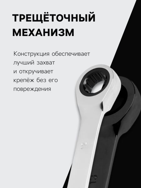 Ключ комбинированный трещоточный ТУНДРА, CrV, полированный, 72 зуба, 12 мм. Ключ комбинированный трещоточный ТУНДРА предназначен для монтажных и демонтажных работ с резьбовым соединением. Ключ имеет две накладные головки: рожковую и трещоточную. Благодаря трещоточной головке с 72 зубьями увеличивается крутящий момент и возможные углы работы с крепежом. Корпус инструмента изготовлен из хромованадиевой стали, что обеспечивает ключ стойкостью к большим нагрузкам.