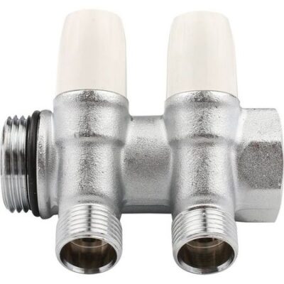 Распределительный коллектор TIEMME (ТИММЕ) 1″x1/2 на 2 выхода, хром, с наружной резьбой с запорными кранами MAXIMA и уплотнительным кольцом используется в сантехнических системах для развода рабочей жидкости по точкам водоразбора. Надежное устройство из латуни с хромированным покрытием устойчиво к разного рода повреждениям.