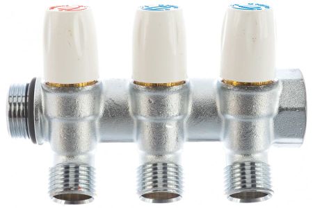 Распределительный коллектор TIEMME (ТИММЕ) 3/ 4″x1/2 на 3 выхода, хром, с наружной резьбой поставляется с запорными кранами на каждой линии, которые обеспечивают перекрытие потока. Модель позволяет создать 3 контура отопления, имеет модульную конструкцию с возможностью подключения дополнительного коллектора.