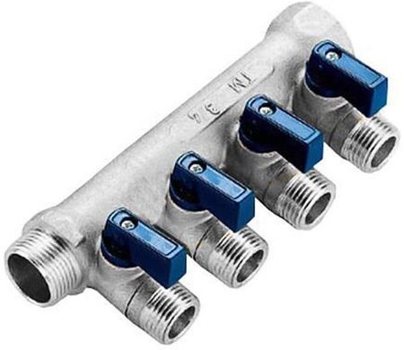 Коллектор распределительный TIEMME (ТИММЕ) 3/ 4″x1/2 на 4 выхода, никель, с наружной резьбой с четырьмя шаровыми кранами используется в инженерной сантехнике. Латунный корпус отличается прочностью и надежностью в эксплуатации, стойко переносит всевозможные повреждения благодаря покрытию из никеля.