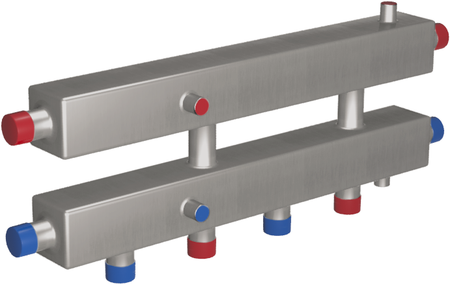 Коллектор из нержавеющей стали RISPA (Риспа) КМГ100-3ВН НЕРЖ. для отопительных магистралей. Гидравлический распределительный узел с модульным коллектором позволяет присоединяться к котлу, мощность которого не превышает 100 кВт. Два потребителя подключается снизу и 1 сбоку, что упрощает подключение и монтаж.