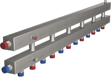 RISPA (Риспа) КМГ100-7ВН НЕРЖ. — коллектор из нержавейки от российского бренда. Схема установки и подключения — горизонтальная. 6 потребителей подключается с нижней стороны, а в боковой части доступно подключение еще одного контура. Нержавеющая сталь отлично справляется с воздействием воды и высокой влаги.