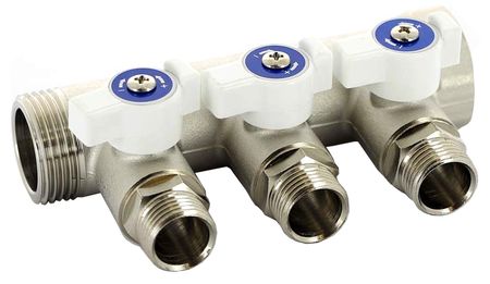 Коллектор Uni-Fitt (Уни-Фит) НВ 1×3 вых 1/2 40 мм с кранами, никелированный используется в системах отопления и водоснабжения для распределения потоков воды и теплоносителя. Три отвода оснащены вентилями с цветовой индикацией. Арматура выполнена из никелированной латуни, устойчивой к коррозии и механическому воздействию.