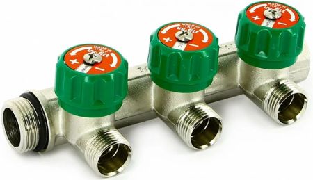 Коллектор Uni-Fitt (Уни-Фит) НВ 3/4 3×1/2 Н 50мм с выходами под 90, под плоскую прокладку, никелированный с вентил выполнен из высококачественнной латуни и оснащен двумя отводами с запорно-регулирующими вентилями. Рукоятки вентилей под прямым углом обеспечивают удобный доступ для управления. Межосевое расстояние отводов 50 мм значительно упрощает монтажные работы.