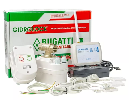 Gidrolock (Гидролок) WIFI WINNER BUGATTI 3/4 — комплект из нескольких узлов, которые отслеживают состояние водопроводной системы. В случае обнаружении влаги на электродах, датчик передает сигнал на управляющее устройство, оно перекрывает подачу воды и информирует владельца через уведомления. Минимизирует возможный ущерб от протечек.
