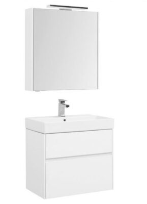 Комплект мебели для ванной Aquanet Бруклин 70 состоит из подвесной тумбы с раковиной и зеркального шкафа — все белого цвета. В комплекте соединились модели из разных коллекций: тумба "Бруклин" шириной 70 см и зеркальный шкаф "Латина" шириной 70 см. Корпус изделия выполнен из выкрашенного белой краской влагостойкого ЛДСП, фасады – из МДФ. В тумбе интегрированные ручки, когда открывание происходит за счет выступающей детали верхней или нижней части фасада, которая срезана под углом, в результате чего образуется выемка, служащая ручкой. Раковина из керамики с тонкими изящными бортиками идет размер в размер с тумбой, в результате чего все изделие выглядит как единое целое. На контрасте с белизной внешних деталей стильно смотрится корпус выдвижных ящиков, выполненный в цвете «дуб сонома». Нижний ящик тумбы имеет большую зону хранения, верхний разделен на несколько отделений, которые помогут грамотно разложить все необходимое по своим местам.
