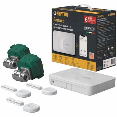Система защиты от протечки воды Neptun (Нептун) Bugatti Smart 3/4 Tuya представлена комплектом из трех компонентов: модуля управления (контроллера), имеющего широкий функционал, трех проводных датчиков, отправляющих сигнал о протечке, и двух кранов, автоматически перекрывающих трубопровод в случае протечки. Системой можно управлять со смартфона через мобильное приложение. При необходимости ее функционал можно расширить с помощью дополнительных модулей.