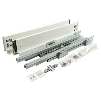 Система выдвижения с двойными металлическими боковинами Lembox-84-500-WT-S представляет собой готовый комплект для создания выдвижного ящика. Самостоятельно требуется изготовить дно, заднюю стенку ящика и фасад.<br> Тонкие прямоугольные боковины впишутся в любой интерьер и мебельный стиль.<br> Благодаря толщине боковины всего лишь 12,8 мм ящик собирается с минимально возможными потерями полезного пространства. <br> Бесшумность хода и плавное скольжения обеспечивает зубчато-реечный синхронизирующий механизм, встроенный в каждую направляющую.<br> Боковые стенки изготовлены из прочной листовой стали и покрыты полимерно-порошковой краской, предохраняющей металл от коррозии. Благодаря этому ящики можно использовать в мебели для ванных комнат.<br> Механизм направляющих рассчитан на нагрузку до 35 кг и 50000 циклов открывания/закрывания.<br> Комплектация: направляющие – 1 комп., боковые стенки – 1 комп., держатель задней стенки – 2 шт, фасадное крепление – 2 шт., декоративные заглушки – 2 шт., крепеж.