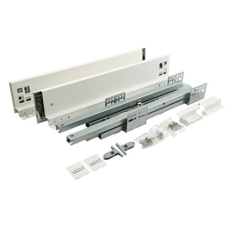 Система выдвижения с двойными металлическими боковинами Lembox-84-450-WT-S представляет собой готовый комплект для создания выдвижного ящика. Самостоятельно требуется изготовить дно, заднюю стенку ящика и фасад.<br> Тонкие прямоугольные боковины впишутся в любой интерьер и мебельный стиль.<br> Благодаря толщине боковины всего лишь 12,8 мм ящик собирается с минимально возможными потерями полезного пространства. <br> Бесшумность хода и плавное скольжения обеспечивает зубчато-реечный синхронизирующий механизм, встроенный в каждую направляющую.<br> Боковые стенки изготовлены из прочной листовой стали и покрыты полимерно-порошковой краской, предохраняющей металл от коррозии. Благодаря этому ящики можно использовать в мебели для ванных комнат.<br> Механизм направляющих рассчитан на нагрузку до 35 кг и 50000 циклов открывания/закрывания.<br> Комплектация: направляющие – 1 комп., боковые стенки – 1 комп., держатель задней стенки – 2 шт, фасадное крепление – 2 шт., декоративные заглушки – 2 шт., крепеж.