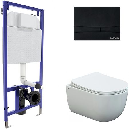 Комплект унитаза Berges Ventas Rimless с инсталляцией Novum 043344 с сиденьем Микролифт и Черной SoftTouch клавишей смыва.