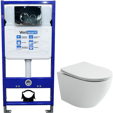 Комплект унитаза Ceramicanova Uno Rimless CN11001 с инсталляцией WellWant Standart 50 WWISI1110B, с сиденьем Микролифт и клавишей смыва Хром глянцевый.