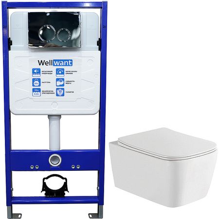 Комплект безободкового унитаза WellWant Tesoro WWU01111W с инсталляцией WellWant Standart 50 WWISI1110B с ультратонким быстросъемным сиденьем Микролифт и клавишей смыва Хром глянцевый.